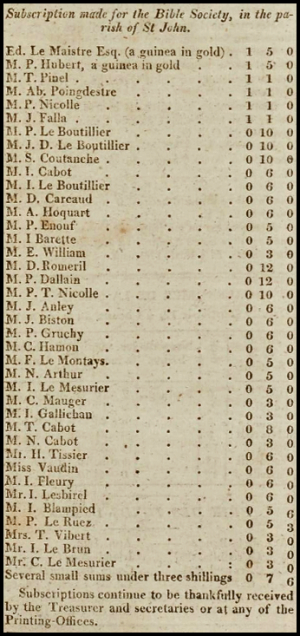 The Seigneur of St John, retired as a Jurat on the grounds of age and infirmity, has also subscribed a pound a year, plus an initial two pounds, having been informed of the progressive improvement of the institution, by which many poor children, who were running through the streets of St Helier, begging and stealing, are now receiving a moral and religious education.