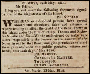 This was an extremely important year for newspaper publishing in Jersey, with the launch of Chronique de Jersey on 1 January. It was a far more professional publication than the Gazette de l'Ile de Jersey and Gazette de Cesaree with which it was initially in competition. The former would fold within the year and the latter lasted until 1819. However, after being largely absent from the Société Jersiaise collection in recent years, the Gazette de l'Ile de Jersey published by Philippe Mourant, is again available to contribute to the 1814 history.
