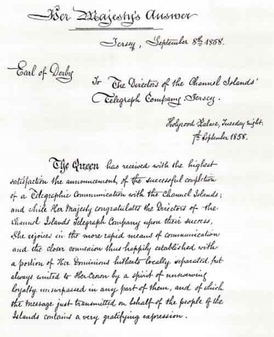 - ”Her Majesty being in Scotland, the message had to be retransmitted from London, which caused it to arrive at a rather late hour in the evening at Holyrood Palace, but notwithstanding the lateness of the evening, Her Majesty dispatched her reply that same night, but as we little expected to receive it that evening, we closed our office, so that it was not until early the next morning that we received Her most gracious reply, which gave the most heartfelt satisfaction to the whole of the inhabitants.