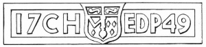 The stone which bears the date 1749 and the initials 'CH' (Charles Hue) and 'EDP' (Elizabeth du Pre), is remarkable for the curious shield that occupies its centre. This shield, at first sight, appears to be of heraldic significance; but a closer examination shows that it bears only a jumble of meaningless symbols which defy heraldic interpretation. Senator Philip Le Feuvre, the owner of Perry Farm, had the kindness to supply the following information: