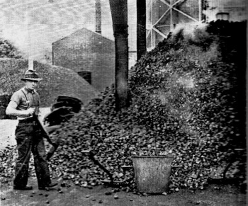 Until 1931 the coal was introduced by mkanual labour, but today a large machine operating on a railway track and served by conveyor chains, backs up to the opened end of the retort and pushes the fresh coal in to take the place of the carbonized coal which is ejected as coke at the other end, where it is in turn carried out by underground conveyor chains, copoled by water, and thence by overhead conveyors to the coke stacks, where it is graded for specialised use.