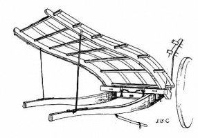 The gindas or rouoleux, also known as le vitheveau, is the windlass or roller, usually oak, on which is wound the rope for tying the load. This apparatus is built in the tchulon as a further extension of some 10 inches, though included in the length of 4 ft as already mentioned for the tchulon, and consists of a solitary wooden dowel or peg (eune guevil'ye) in the roller (for holding and tying the rope) and two slats (les clies) roughly 2in wide by 2ft in length and 1in thick, which could be inserted into the two slots in the roller for tightening purposes and also for stopping the roller from turning once the rope was sufficiently taut.