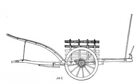 Here, then, would be material for further study, since we had in Jersey the various types of carts. For instance, (a) the bas hernais (very low axle cart), such as the hernais a cidre (or hernais a futs), (b) the d'mie-bas (low axle cart, but higher from ground than (a), (c) the quart-bas (high axle cart) and (d) the drait or haut hernais (straight and high axle cart with, nowadays, smaller wheels). It may be well to say that (a) is now no longer to be seen in use.