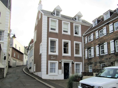 Facing north, at right angles to adjacent buildings, gable on to the street. Three storeys plus attic, three bays. Slate roof with rendered stack.
