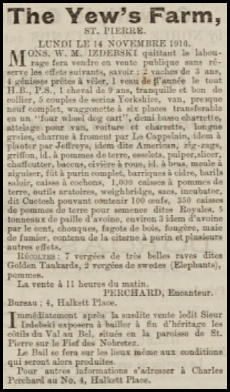The Yews was sold on 31 March 1866 to Jean Simon, a prosperous draper, shipowner and man of property, whose properties included the present-day St Peter's Country Hotel, known then as Simon's Drapery Establishment. Jean Simon, who had served as Constable of St Peter, 1842-52 and 1855-64, died in 1887 and in the partage of his real estate The Yews and some land was apportioned to the deceased's second son, Alfred William Simon, a farmer. The rest of The Yews land was divided between the heirs of Simon's deceased eldest son, Jean Simon, and the latter's sisters, Jane and Louisa. The Yews would never again be a large farm.