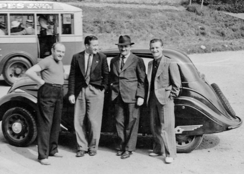 An Allard K1 on the beach in St Brelade's Bay with its owner, Bob Le Breton, and friends. Mr Le Breton was given the car by his uncle in 1948. The number plate, J111, no longer attached to the car, sold at auction in March 2018 for £54,000