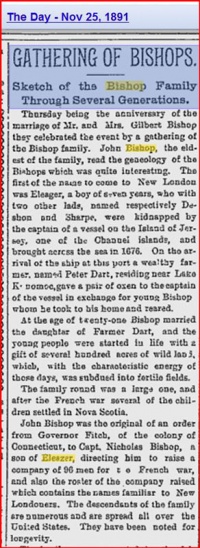 Like many such family legends, the truth is more than a little difficult to discover. One of the earliest surviving reports, in The Day, a New London, Connecticut, newspaper of 25 November 1891, relates to a gathering of the Bishop family, to celebrate the wedding anniversary of Gilbert Bishop and his wife. The eldest member of the family, John Bishop, is supposed to have read details of the family’s history. However, the date the newspaper report gives for the ‘kidnap’ is 1676, seven years before Eleazar was born – not seven years after.
