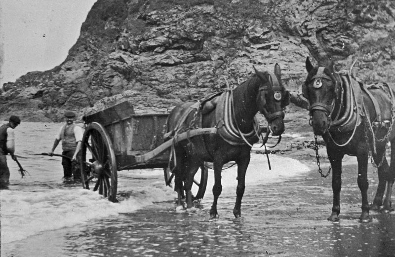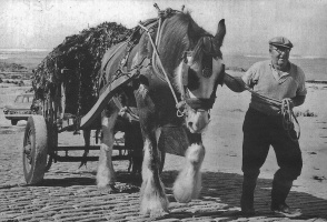 - The sight of a horse pulling a cart dripping with newly gathered vraic, rich brown and glistening, and with a vraic fork or two sticking out from the back of the load, has gone forever, as also the sound of cart¬wheels rumbling over the granite setts of a slipway.