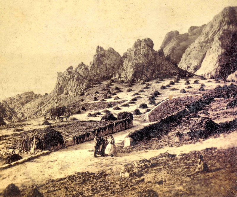 - "Though regular vraicking is permitted only at stated times, yet, as in tempestuous weather large quantities are torn from the rocks, and drifted onshore, the farmers are at all times on the watch so that, even in the midst of winter, whole families, comprising men, women, and children, of both sexes, are seen raking together the highly prized boon of Neptune, and sometimes breast high in the water; vraicking, like a Catholic holiday, suspending all other secular employments.