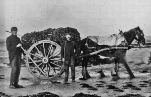 - So eager were the vraic gatherers to obtain all they could that they would sometimes remain on the beach until the carts were floating and the horses swimming; they even carted the precious seaweed on their backs up cliff sides. The traditional vraicing carts, the four-pronged vraicing forks and the vraicing hooks are things of the past.