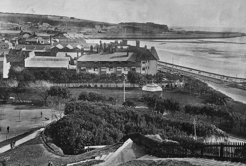 View across West Park area to St Helier Harbour and Fort Regent from Westmount in the 1880s. The Marine Hotel and Baths in the middle, later the site of the Grand Hotel, with derelict site covered in rubble and timber alongside, part of West Park station in construction, and the bare site of Traingle Park